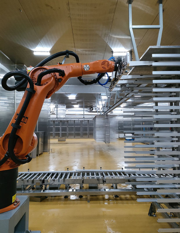 پالتیزاسیون در انتهای خط: این ربات می تواند محصولات غذایی بسته بندی شده را به طور کارآمد مانند جعبه ها، کیسه ها یا کانتینرها را روی پالت ها برای حمل و نقل انباشته کند.که باعث می شود آن را برای محصولات متراکم مانند کیسه های آرد یا کالاهای کنسرو شده ایده آل کند..